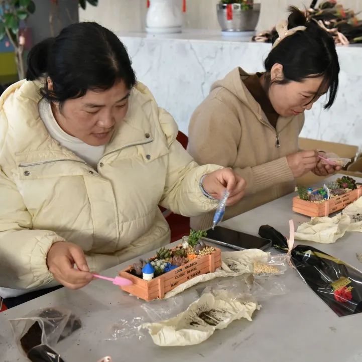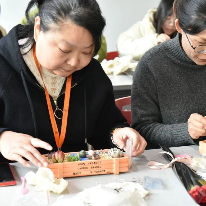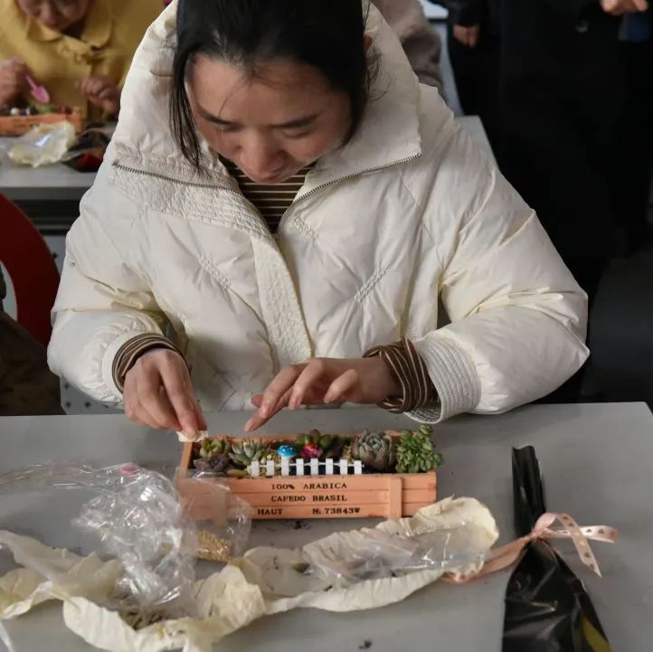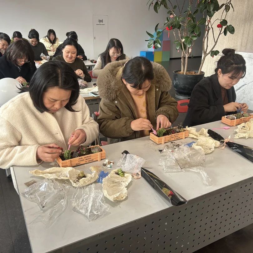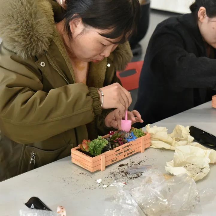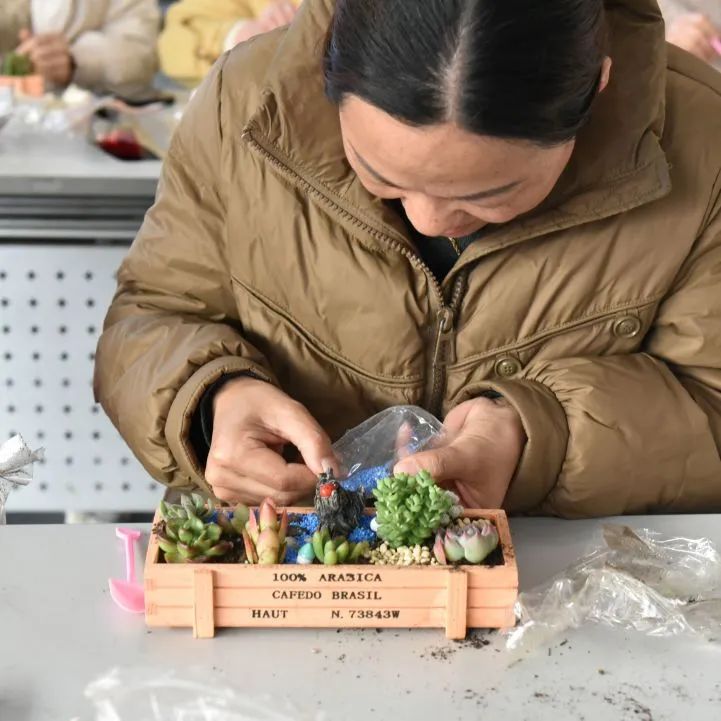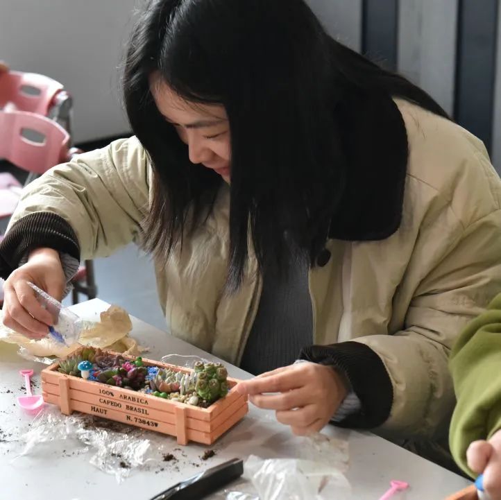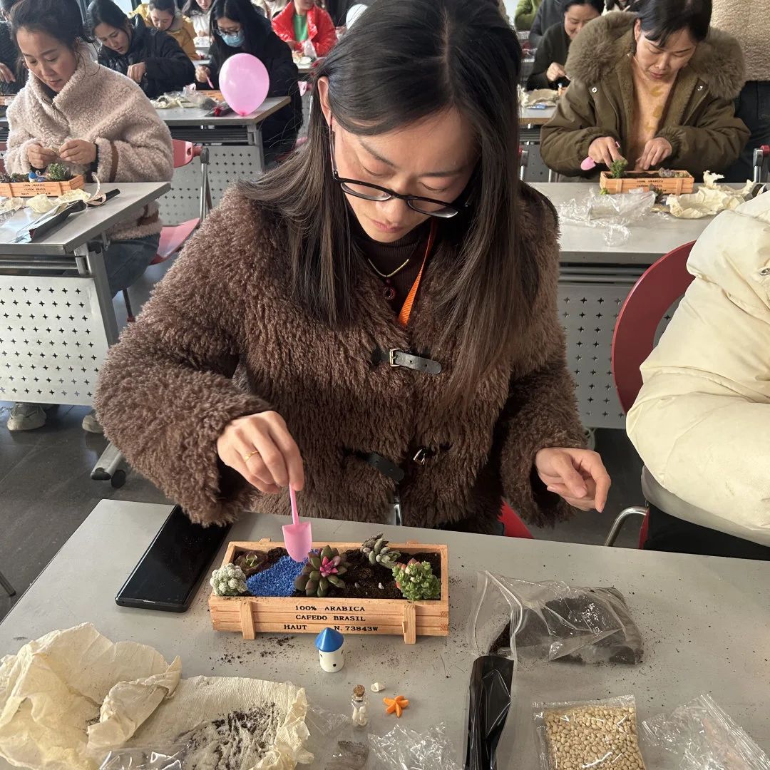 在自由创作环节,大家化身巧手园丁。精选的各类多肉绿植,搭配小巧花盆、彩砂铺面石与趣味装饰,激发无限灵感。